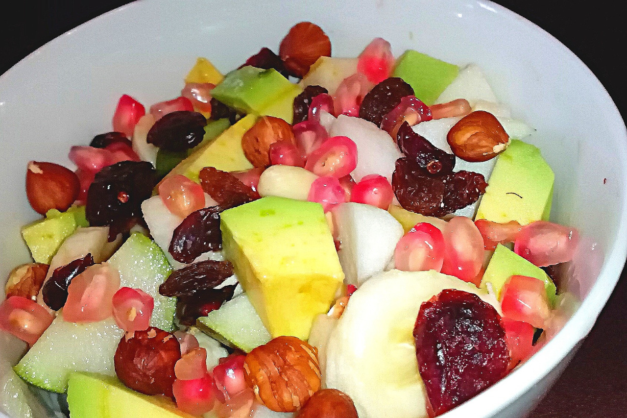 Avokádo, hrušku, jablko a banán nakrájame na menšie kúsky, premiešame, pridáme zrnká z granátového jablká, posypeme hrozienkami, brusnicami a orieškami.